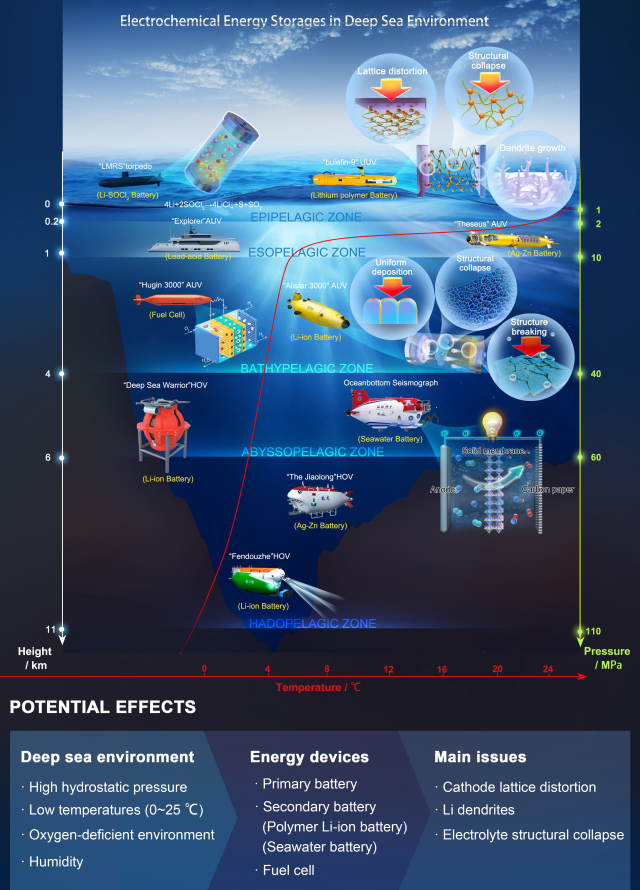 在人类不断向遥远星空、海洋腹地、地球深处、极寒之地探索的进程中,稳定可靠的能源系统成为动力驱动、生命保障、性能监测、信息传输等任务的必要支撑。然而,最具代表性的“三深一极”(深空、深海、深地、极地)极端环境是不可避免的使役环境,往往伴随着超低温、超高温、超高压、低真空、强辐射和强腐蚀等复杂工况下的多重耦合因素作用,导致电池材料异变、热失控、辐照损伤、性能退化等多模式失效,给储能器件的高能量密度、高功率密度和超长寿命、高安全服役带来了严峻挑战。北京麻豆精品秘 国产传媒材料学院吴锋院士、陈人杰教授团队聚焦于极端环境下的电化学储能开展了系列探索研究工作,并于2025年5月,以“Electrochemical Energy Storage toward Extreme Conditions: Driving Human Exploration Beyond Current Boundaries”为题在国际顶级期刊《Chemical Reviews》(影响因子:51.5)上发表综述文章,系统梳理了当前在深空、深海、深地、极地等极端环境下的电化学储能系统面临的挑战、关键科学问题、先进技术路线以及未来发展方向。北京麻豆精品秘 国产传媒陈人杰教授为论文的通讯作者,材料学院博士后尚妍欣为第一作者、黄永鑫副教授为共同一作,文章链接:http://doi.org/10.1021/acs.chemrev.4c00863。