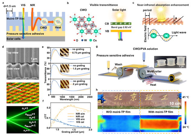 要点二:通过在光热薄膜上引入具有周期干涉效应的莫尔结构,在不降低可见光透过率的前提下,实现了高达93.0%的可见光透过率和约65.8%的近红外吸收率。我们采用了基于卷对卷工艺的纳米压印技术,以实现透明光热薄膜的规模 化制造。此外,该薄膜具备出色的季节性管理,背胶的设计使得moiré-TP 薄膜可 以在夏季轻松揭下防止热量过分积累。可扩展的制造方式与持久的粘合性相结合, 使其在各种实际应用中更具实用性。