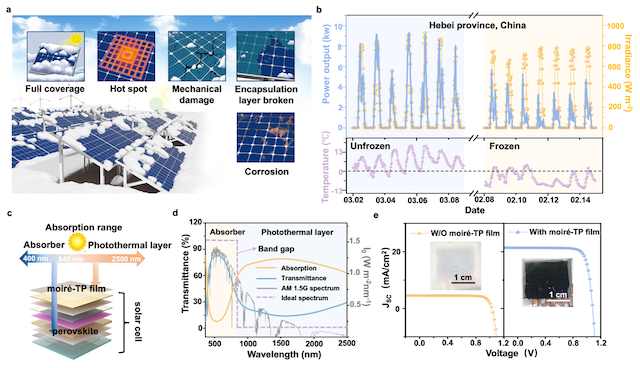 在寒冷气候地区,冰雪覆盖导致的光遮挡已成为制约光伏系统稳定发电的主要障碍之一,严重时可导致超50%的发电损失。尽管市场上已出现多种加热除冰方案,但这些方案难以满足大面积户外光伏系统长期稳定运行的需求。理想的光热防冰解决方案应具备三大特性:高光透过性(保障电池正常工作)、高光热效率(实现快速除冰)、可规模化制备与长期稳定性。但现有光热薄膜在“透光发电”和“光热除冰”之间往往难以兼顾,需要对光学设计进行调整,以在设备和光热薄膜之间实现最佳的阳光吸收平衡。