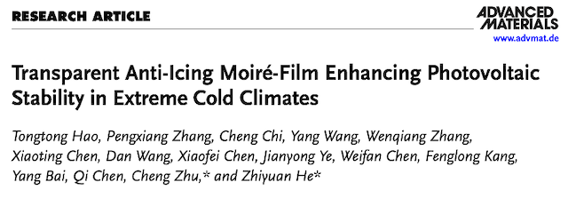 T. Hao, P. Zhang, C. Chi, Y. Wang, W. Zhang, X. Chen, D. Wang, X. Chen, J. Ye, W. Chen, F. Kang, Y. Bai, Q. Chen, C. Zhu, Z. He, Transparent Anti-Icing Moiré-Film Enhancing Photovoltaic Stability in Extreme Cold Climates. Adv. Mater. 2025, 2507034. http://doi.org/10.1002/adma.202507034