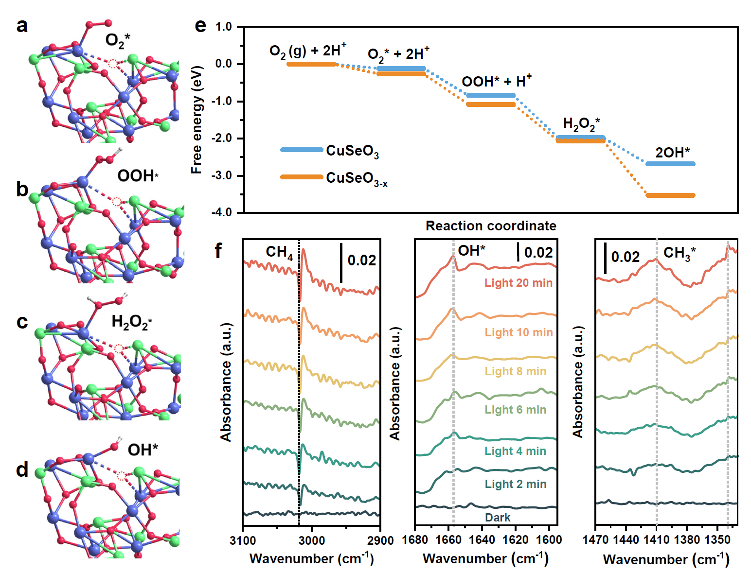 原位XPS研究表明,Cu2+与Au能够分别捕获光生电子与空穴,实现载流子的高效分离。香豆素荧光实验与自由基淬灭实验证明•OH自由基完全来自O2还原反应,而•CH3自由基由•OH活化CH4分子产生。DFT计算表明,CuSeO3-x中的CuII-Ov位点构成了一个独特的活性中心,其既能捕获LSPR激发产生的热电子,又能为O2还原为•OH自由基的反应过程提供有利的动力学路径。