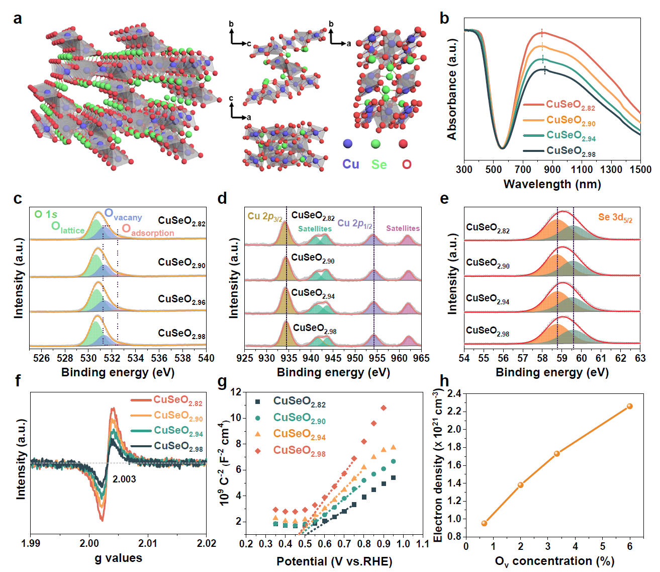 研究团队通过调节水热反应中Cu源与Se源前驱体的摩尔比,成功制备出一系列富含氧空位的三斜晶系CuSeO3-x材料。XPS、EPR与莫特-肖特基测试表明改变前驱体比例可精确调节氧空位及自由电子浓度,从而使材料在700-1300 nm近红外光范围内呈现强烈的LSPR吸收。