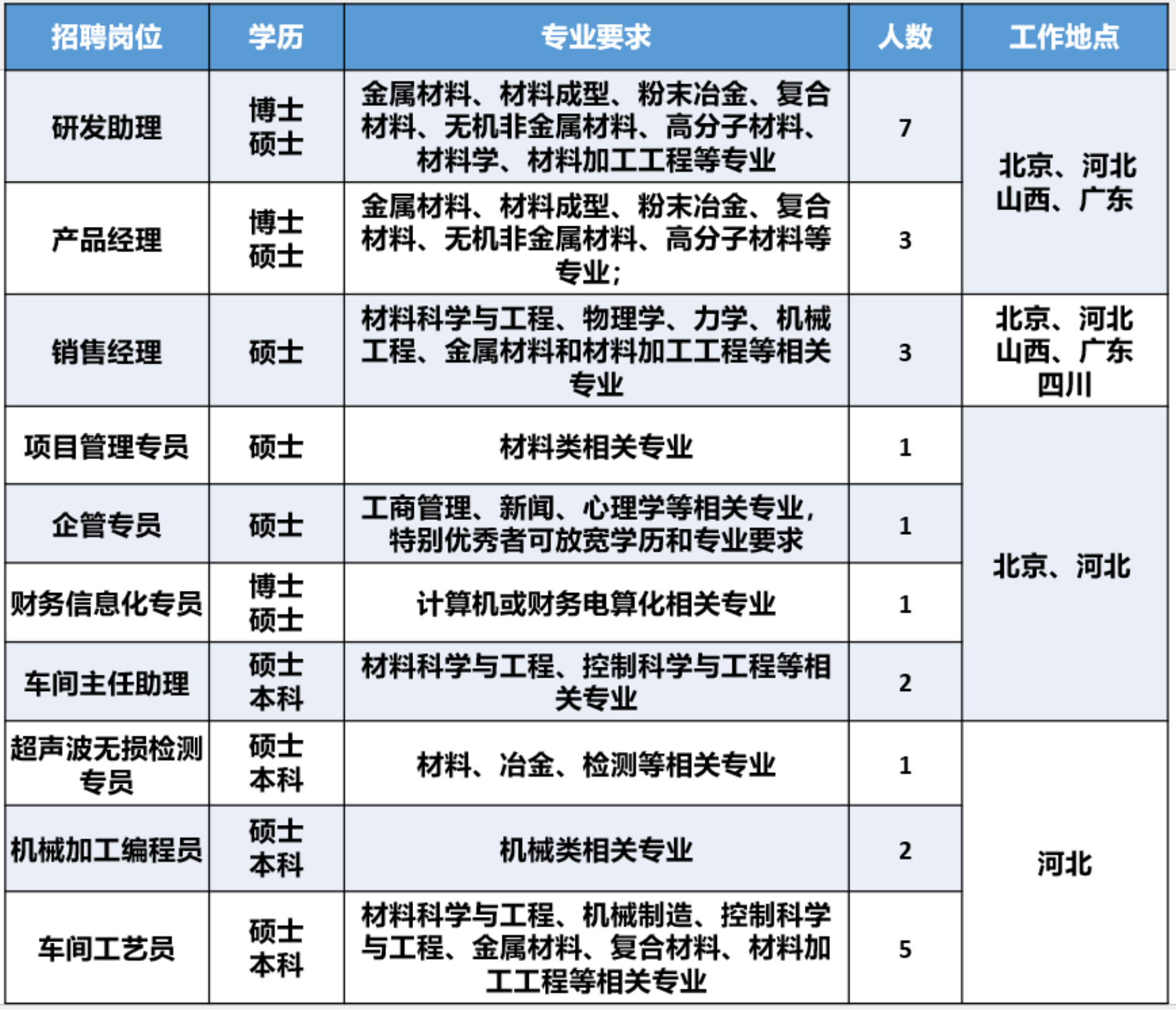 1、本科及以上,材料科学与工程、机械制造、控制科学与工程、金属材料、复合材料、材料加工工程等相关专业;